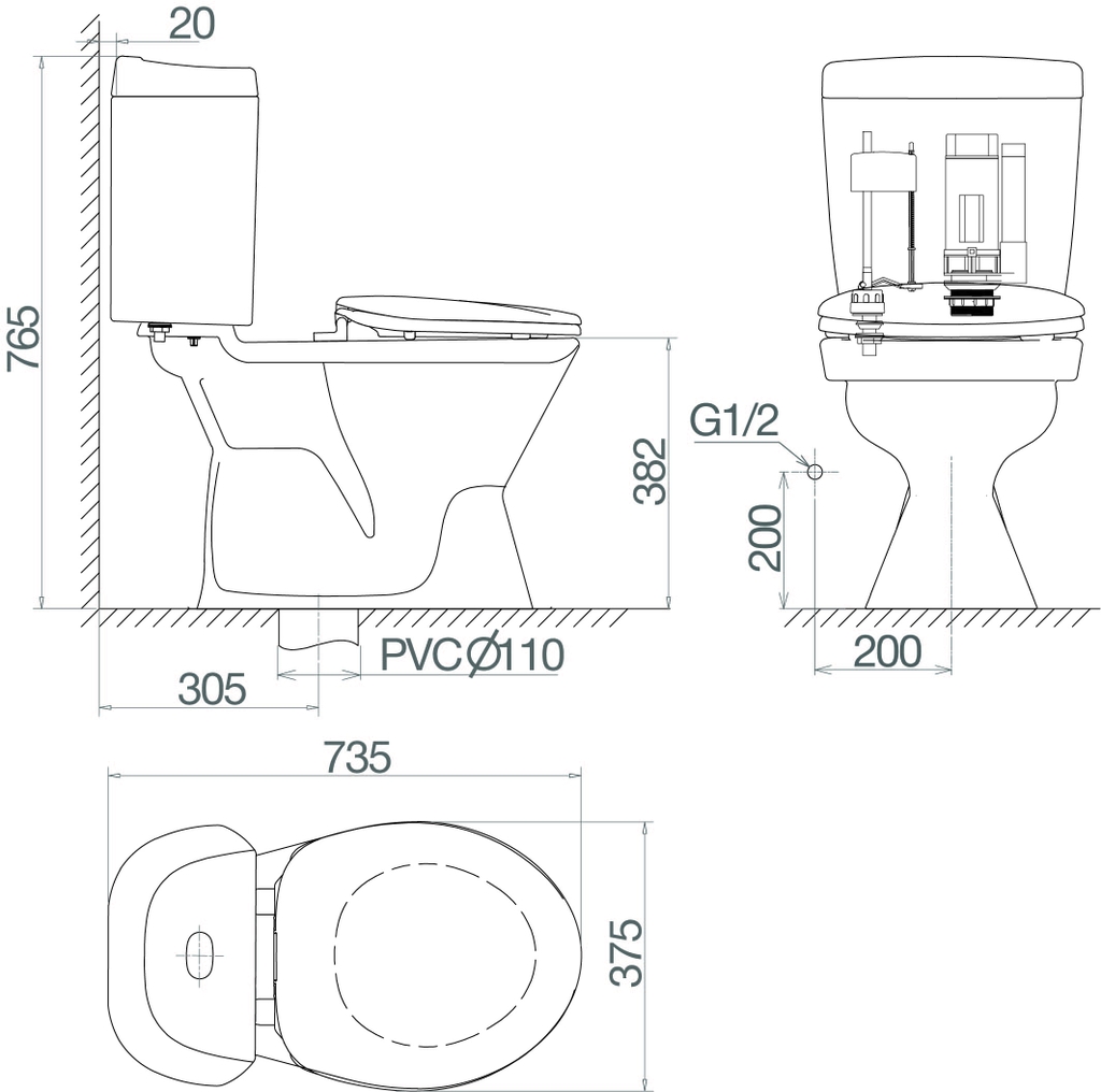 Xả thẳng Washdown: Lượng nước lớn tráng rửa toàn diện lòng bồn cầu, đẩy sạch cặn bẩn nhanh chóng.