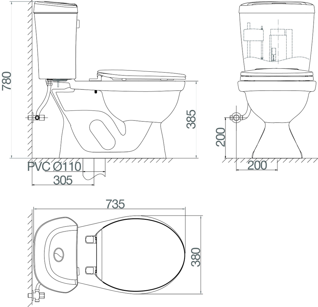 Xả thẳng Washdown: Lượng nước lớn tráng rửa toàn diện lòng bồn cầu, đẩy sạch cặn bẩn nhanh chóng.