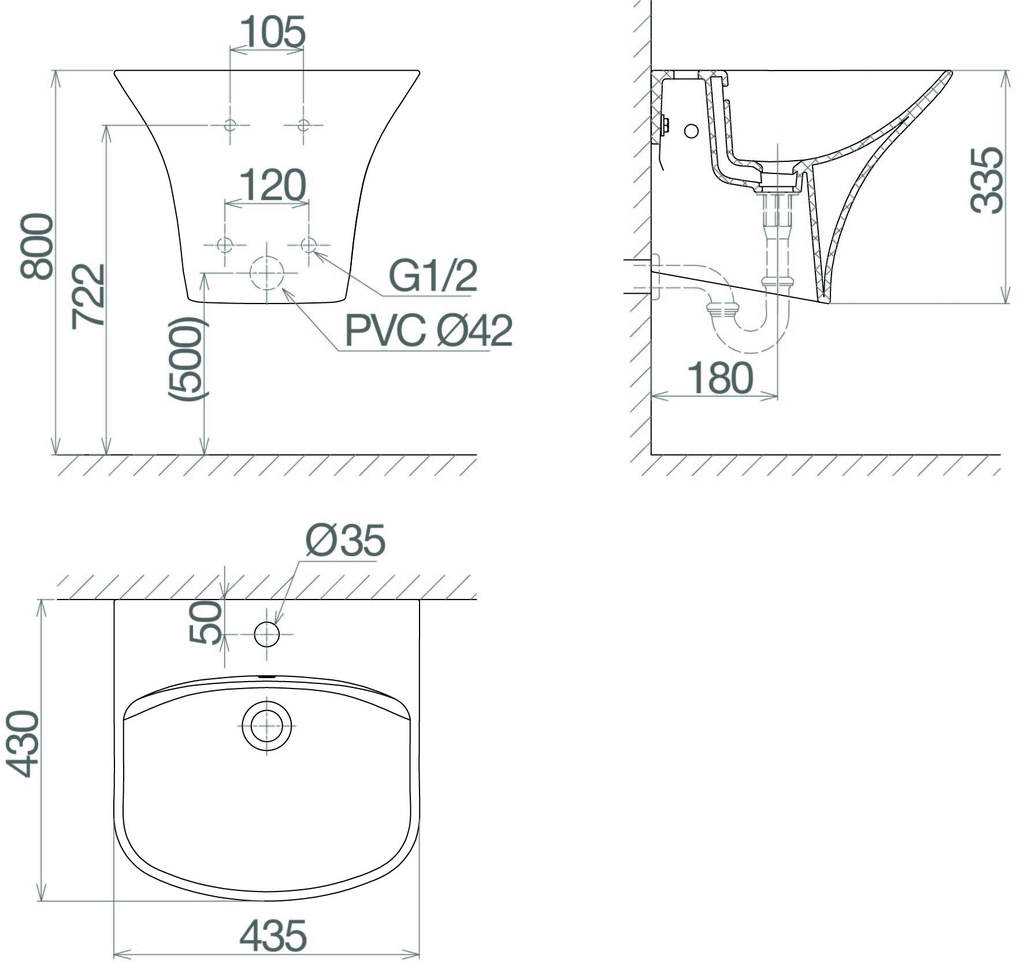 Thiết kế treo tường: Chậu và chân liền khối tối giản, tạo điểm nhấn, đồng thời tiết kiệm không gian tối đa, vệ sinh nhanh chóng, dễ dàng